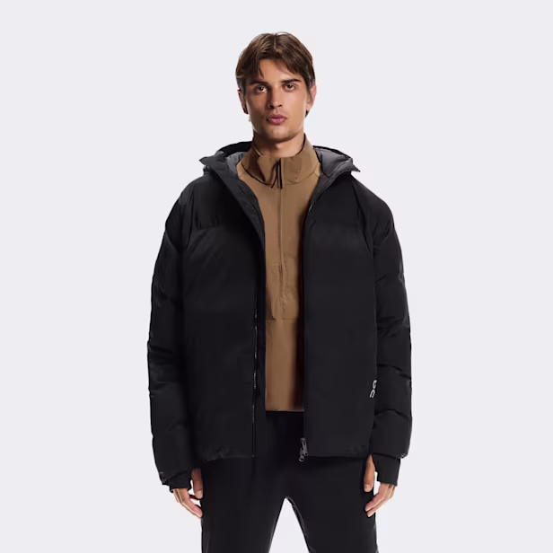 A lightweight black puffer jacket featuring On ThermaTec™ insulation for warmth during active days and travel.
